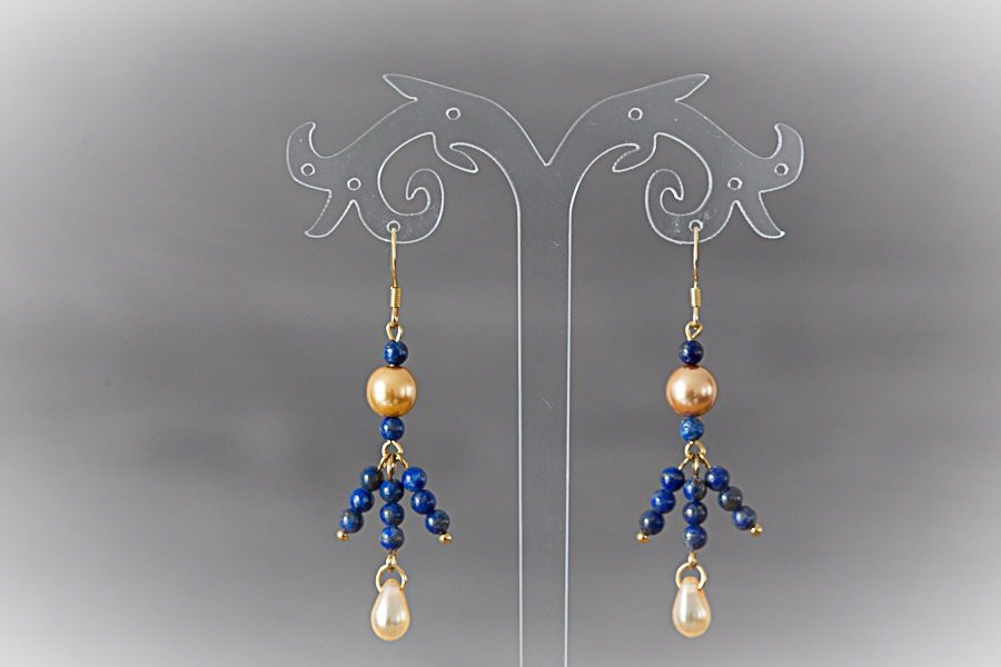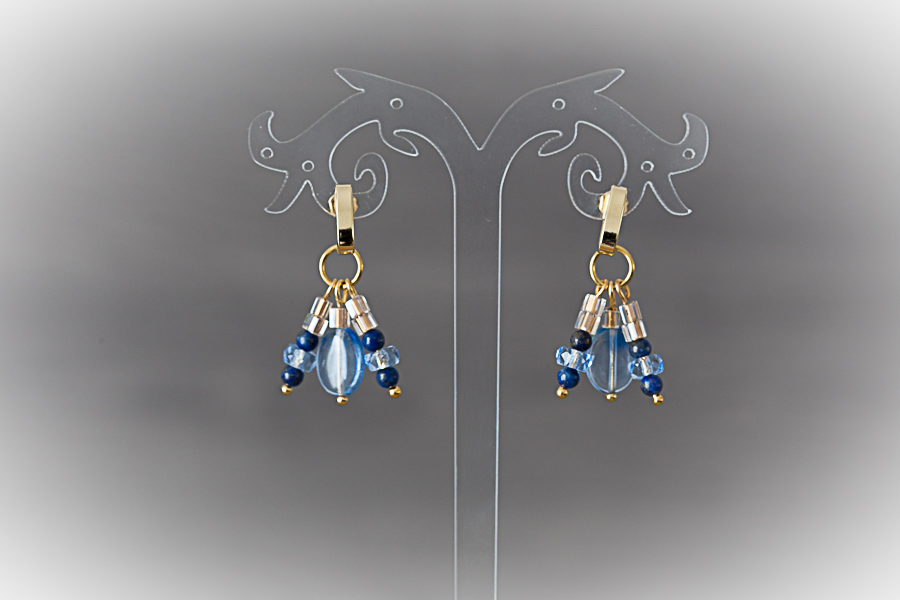 A95 - Boucles d'oreilles dorées, perles lapis lazuli Crochets acier inoxydable doré, 14 mm Perles de lapis lazuli Perles de verre doré 28 € |