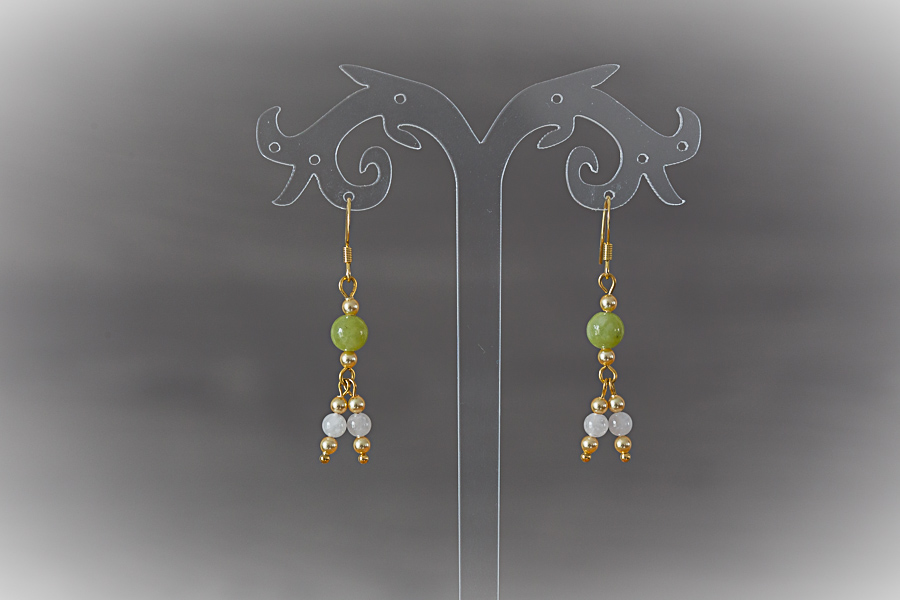 A93 - Boucles d'oreilles dorées, perles péridot et jade blanche Crochets acier inoxydable doré, 14 mm Perles en aventurine et jade blanche Perles de verre doré 18 € |
