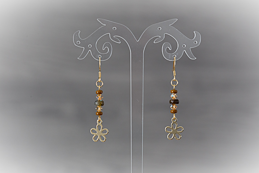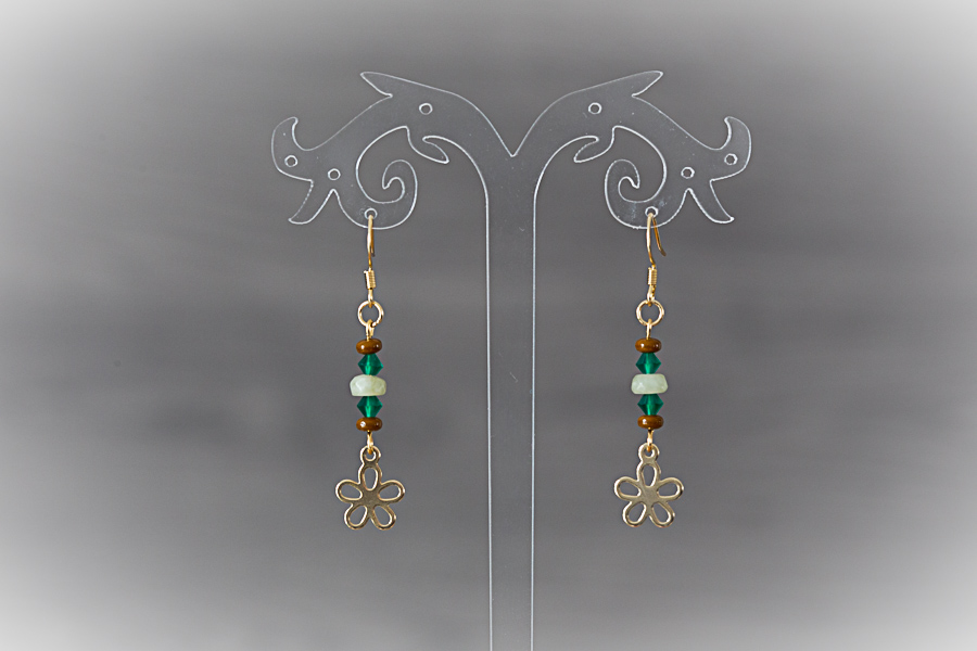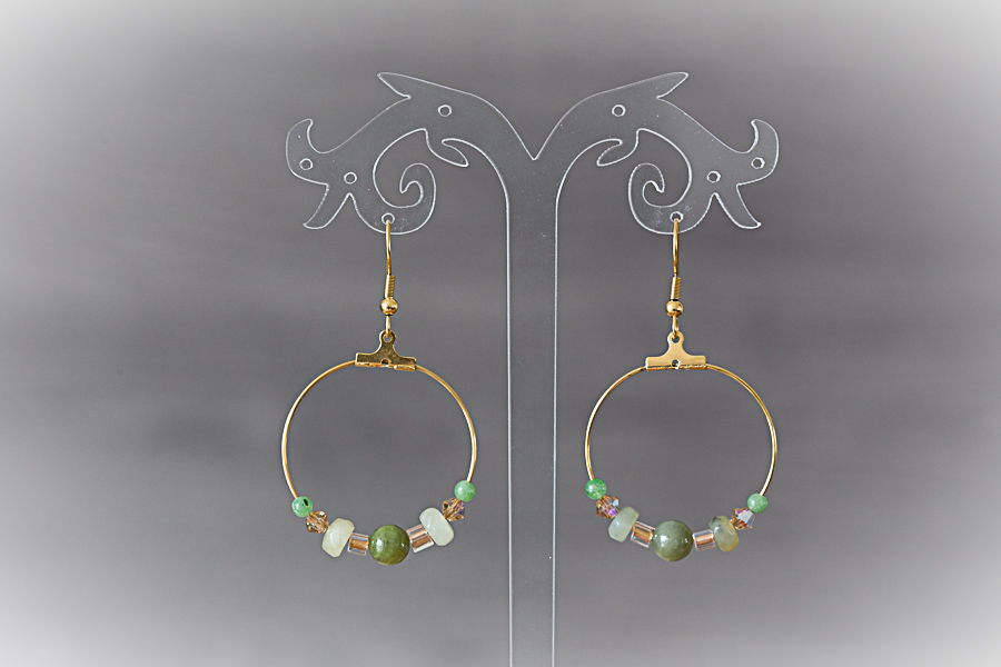 65 - Boucles d'oreilles dorées, fleurs dans le pré Crochets acier inoxydable doré, 14 mm Charms fleurs acier inoxydable doré Perles de jade chinoise et verre 18 € |