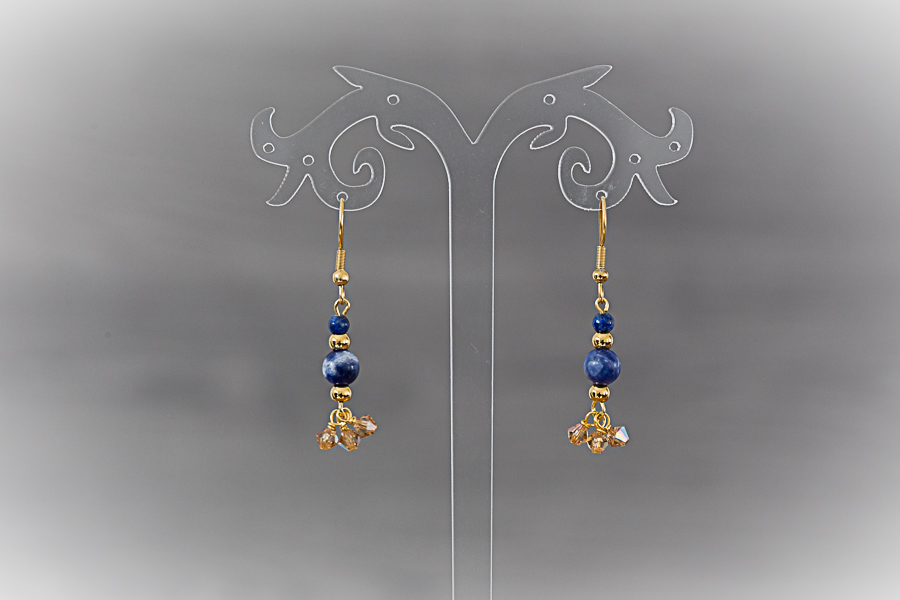 A30 - Boucles d'oreilles dorées, perles lapis lazuli et sodalite Crochets acier inoxydable doré or 18 K Perles de lapis lazuli, sodalite et cristal 18 € |