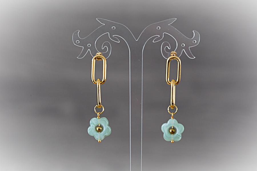 A138 - Boucles d'oreilles dorées, Flora Clous d'oreilles large chaine mailles rectangles en acier inoxydable doré or 18 K Fleurs en résine agrémentées de perle en hématite dorée 22 € |