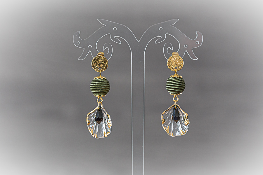 A29 - Boucles d'oreilles dorées or 18 K, perles de rubis zoïsite et pétales Crochets acier inoxydable doré or 18 K, 19,5 mm Composants acier inoxydable et laiton dorés Perles : péridot olive, rubis zoïsite, verre doré 25 € |